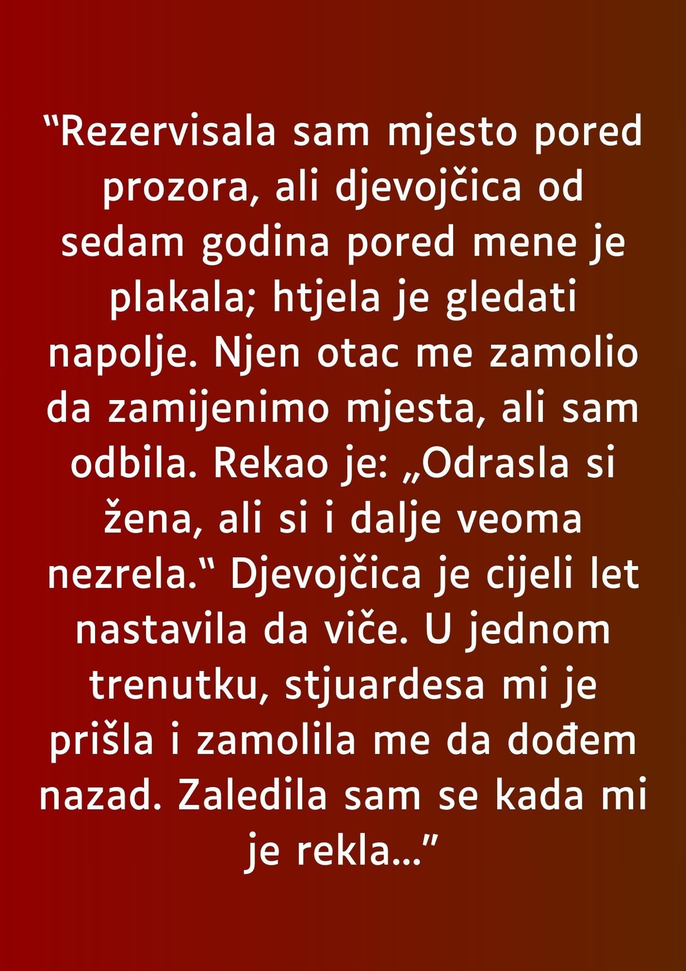 Ja sam sebi rezervisala mjesto pored prozora, platila dodatno ali onda se desava situacija da je jedna djevojcica od sedam godina kojaje bila pored mene plakala jer je ona htjela da gleda napolje i to kroz prozor.