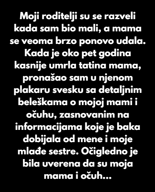 Roditelji su nam se razveli kada sam ja bila mala a mama se nakon toga jako brzo ponovo udala. kada je oko pet godina poslije umrla majka od mog tate pronasao sam u njenom plakaru svesku sa raznim detaljima i biljeskama o mojoj majci ali i ocuhu i tu su bile sve informacije koje je moja baka dobijala od mene ali i moje mladje sestre.