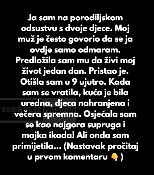 Odlucila sam sve to da uradim, otisla sam u 9 ujutro. Kada sam se ja vratila kuci mogla sam da vidim da je kuca jako uredna, da su djeca nahranjena a pored toga i na stolu je vecera bila spremna. Osjecala sam se kao najgora supruga i majka ikada i nisam mogla da vjerujem da sam ja tako losa.