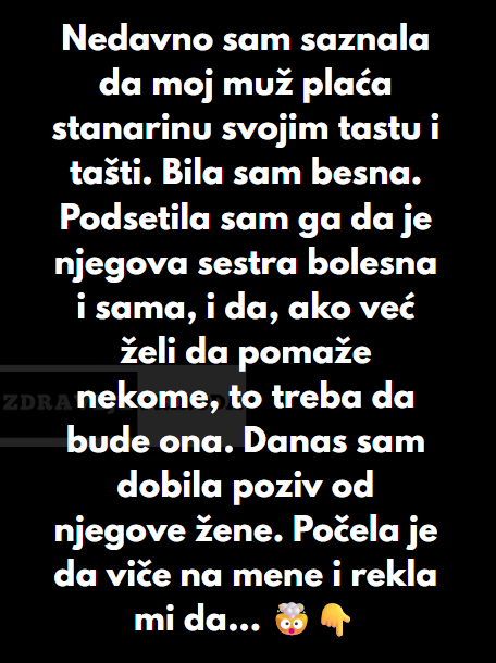 Toliko sa bijesna bila kad sam saznala da moj sin placa stanarinu svom tasti i tasti. Jako sam se naljutila. Posjetila sam ga da mu je i sestra jako bolesna i usamljena a ako vec zeli da nekom pomogne sa svojim ocem da to treba da bude ona jer ima jako skupe terapije sa kojim se sama bori.