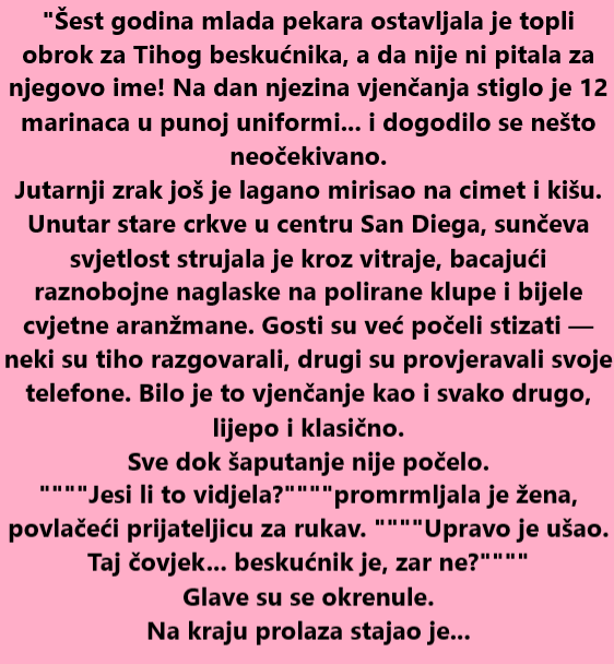 Kada bi zavrsila prvu turu peciva ona bi spakovala jedno sipala kafu i isla na azdnja vrata. Tamo na klupi uvijek pored autobuske stanice ostavila bi paketic sa porukom: “Zelim vam miran dan” I svaki dan stariji gospodin sijede kose je dobijao je taj obrok svjez i topao. Nikada nisu pricali nego su se razumjeli pogledom. Za Emilie je to bio trenutak samo ljudskosti a za druge divna gesta.
