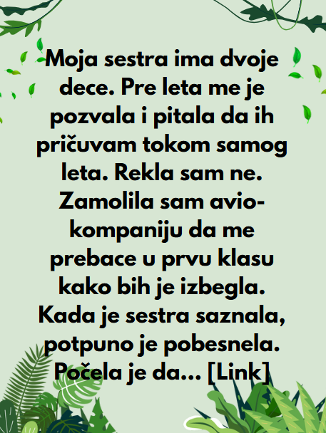 Pozvala me je nedelju dana prije leta i pitala da li ja mogu da pricuvam djecu tokom leta i spomenula kako bi mogli svo vrijeme da se smjenjujemo da spavamo. Rekla sam tada ne i objasila da mi to ne godi a ona mi je rekla: “Pa necak te obozava…” pa cemo se sve dogovoriti tokom leta i odmah mi je prekinula.