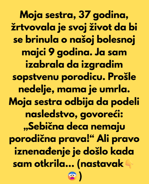 Ali onda dolazi pravo iznenadjenje kada sam otkrila da je nasa majka malo prije nego sto je umrla potpisala zakonski neka dokumenta u kojima sve sto ima ostavlja mojoj sestri i tada mi se sve srusilo. Jer smatram da djeca ne bi smjela da budu razdvajana bez obzira o cemu se radi.