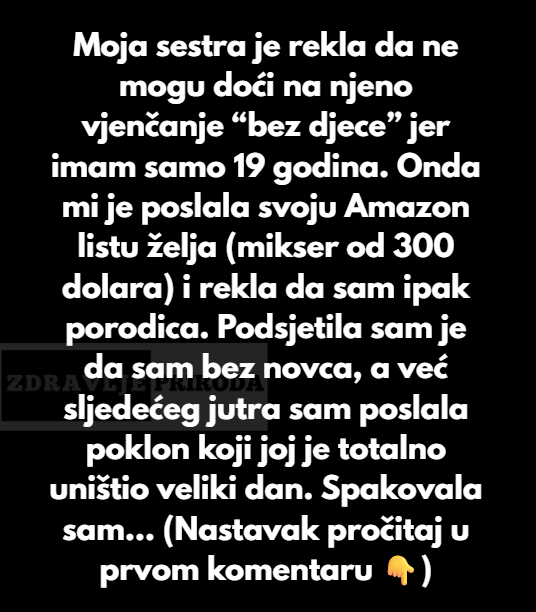 Onda sedmocu dana poslije dolazi nesto, a to je njena Amazon lista zelja. Vidim i pogledam sve to i tu ugledam blender od 300 dolara. Kazem joj da ja nemam novca za takve poklone a ona mi odgovara na to:”Ipak si ti dio porodice…”