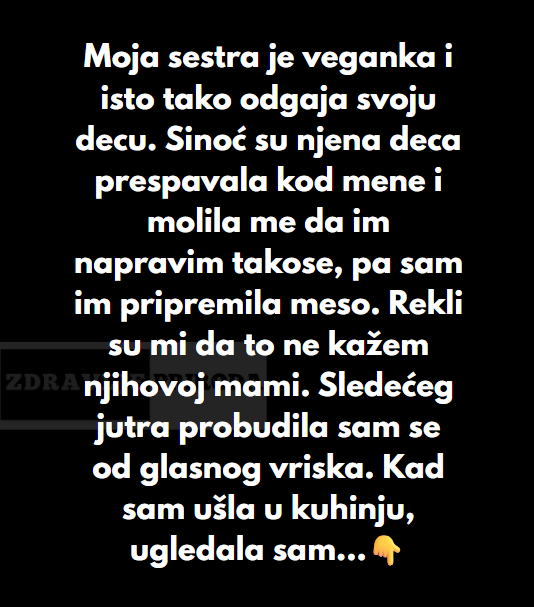 Naime moja sestrra je veganka i od prvog dana na isti nacin odgaja i svoju djecu. Veci dio naseg zivota ona je posvetila tom nacinu zivota. Ono sto sam oduvijek cijenila kod nje jeste to da je uvijek bila posvecena svojoj ishrani i nikada nije bila ni kriticna prema tudjim izborima i tudjim nacinu zivota.