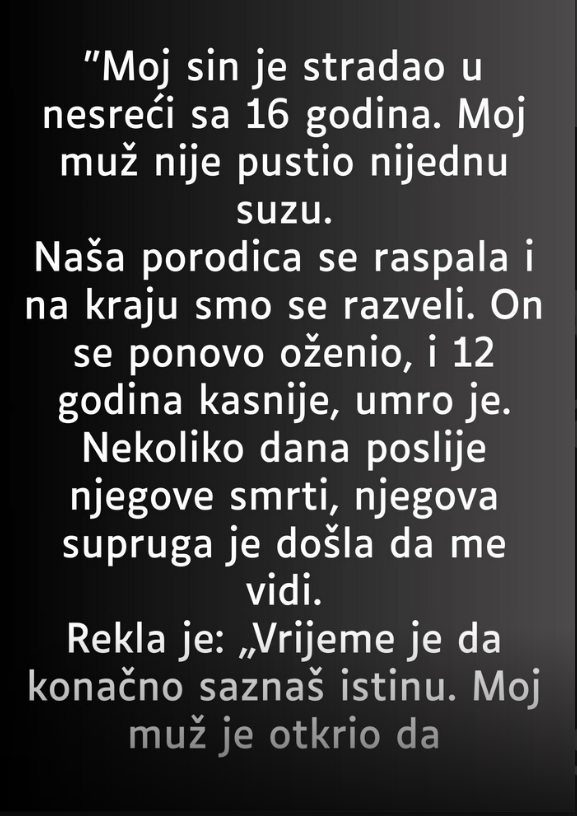 Moj sin je nazalost nastradao u nesreci kada je imao samo 16 godina. Moj suprug tada nije pustio ni ti jednu suzu i to me je toliko potreslo i promijenilo moj zivot.