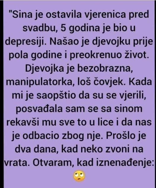 Proslo je dva dana kada cujemo da neko zvoni na vrata. Otvaram u tom trenutku kada iznenadjenje. Ona je pred vratima tu je njegova nova djevojka. Sat i po vremena smo mi pricale sve i svasta da bi rekla da je on smatrao da mu roditelji nikada nisu bili podrska da je shvatio gledajuci to kako su nju njeni roditelji uvijek podrzavali i radi toga je odlucio da nas krene da izbjegava. Pocela sam vikati je rsam to osjetila kao neku vrstu vrijedjanja.Izletila je tada iz kuce i rekla je da se nas dvije ne moramo voljeti dovoljno je od svega toga da se postujemo ali da ce moj sin da ispasta radi toga. Moram da kazem da je upravu. Mogu da vidim da je on jako sretan da ima prijatelje novac i da radi sve sto voli i to radi nje. Ima nekog ko ce da se bori uvijek za nju. Ne volim je ali postujem sve to sto je spremna da uradi za sina i shvatila sam da zelim da budem najbolaj svekrva.