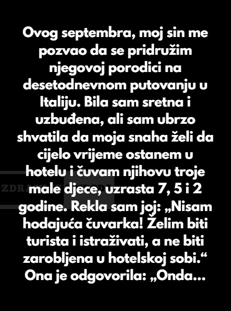 Moja snaha je u tom trenutku ostala sokirana kada sam rekla da ja dolazim i da cu da platim sve svoje troskove. Sin je pokusao na sve nacine da me nagovori da ja cuvam djecu i rekao mi je kao da se od babe to ocekuje!