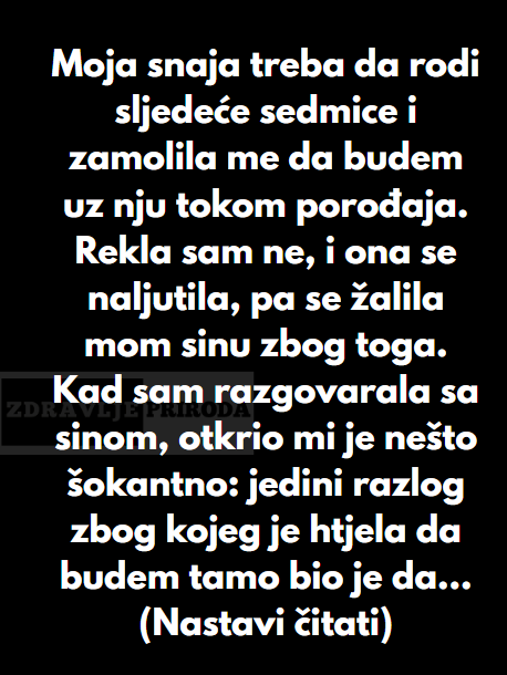 Moja snaha trebala bi da rodi sledece sedmice i to bi bilo moje prvo unuce. Tokom trudnoce sam joj bila zaista od pomoci, nisam bila ona nametljiva osoba i svo vrijeme velike podrska. Obavljala sam sve sitne poslove pomagala sa hranom i nisam se nikada mijesala o odluke ako od njih nisam dobila pitanje. Mislila sam svo vriejme da mi imamo dobar odnos.