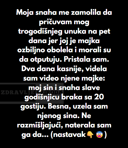 Prije nedelju dana snaha mi je dosla u suzama i molila me je da njenog sina od tri godine pricuvam na pet dana jer joj je majka tesko bolesna. Rekla je da ona i moj sin moraju da putuju kako bi bili sa njima.