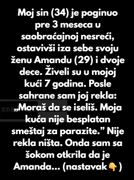 Moj sin Danijel koji ima 34 godine je umro prije tri mjeseca u saobracajnoj nesreci. Ostala je zena njegova Amanda koja ima 29 godina i dvoje djece Itan od sest godina i Kejleba od dvije. Oni su u mojoj kuci zadnjih sedam godina.