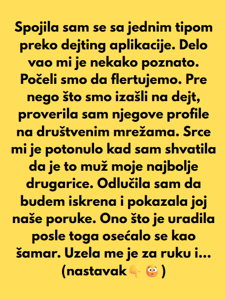 Ja sam odlucila da odem na jednu dejting aplikaciju i tu sam se spojila sa jednim tipom. Djelovao mi je svo vrijeme jako poznato ali smo krenuli da flertujemo a prije nego sto smo otisli na dejt odlucila sam da provjerim sv enjegove profile koje ima na drustvenim mrezama. Srce mi je stalo kada sam shvatila da je to muz moje najbolje priajteljice.