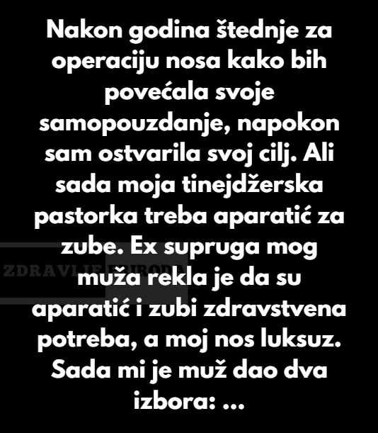 Ja sam godinama stedila i to svjesno da bi napravila operaciju nosa. Ovo nije bila odluka samo u jednom trenutku nego je to bilo zeljno povezano. Napokon smo stigli da sam skupila sve to samo da se pojavi nova porodicna potreba a to je vjerovali ili ne tinejdzerka pastorka treba sada novi aparatic za zube a ja opet na zadnje mjesto.