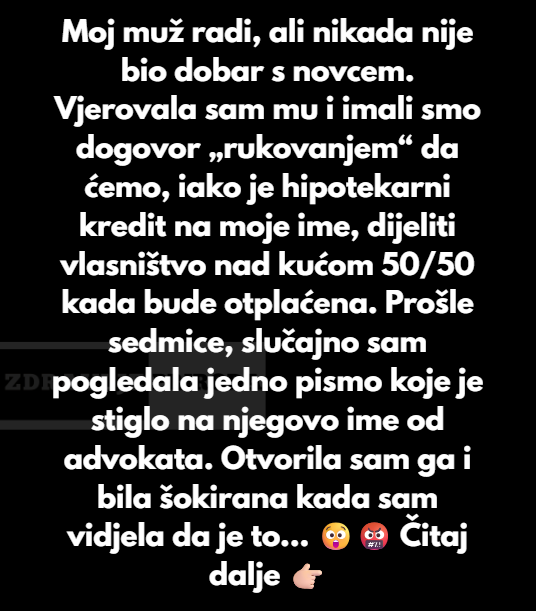 Prosle sedmice sam slucajno vidjela postu koja je bila za Johna i to je od advokata. Otvorila sam i sokirala sam se kada sam vidjela da je to ugovor gdje je puno vlasnistve nase kuce prepisano na Johnovu majku, koja ima 75 godina i zivi u starackom domu. Taj ugovor je potpisan prije godinu dana.