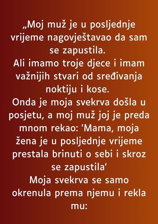 Onda moja svekrva dolazi kod nas u posjetu a moj suprug bez imalo blama je predamnom joj rekao: “Mama moja supruga se u zadnje vrijeme jako prestala brinuti o sebi i sada se skroz zapustila, vise ne lici na sebe.”