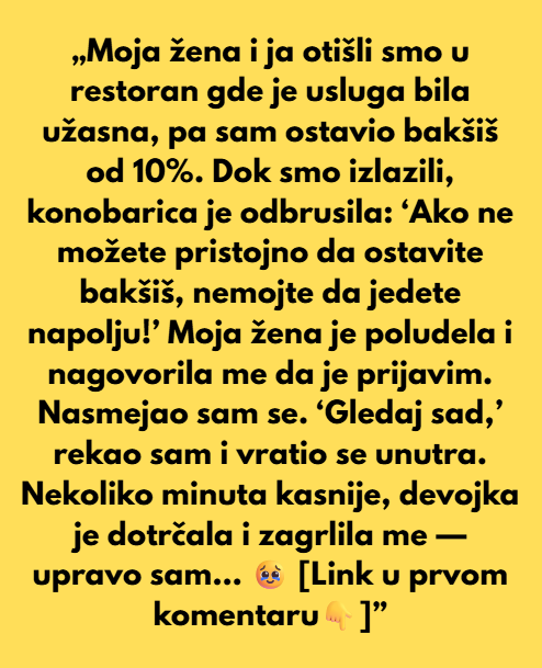 Supruga i ja smo otisli u restoran gdje je usluga zaista toliko losa bila pa sam radi toga jako bijesan odlucio da ostavim samo 10 posto baksisa. Dok smmo mi izlazili konobarica je tako bijesno uzela novac i tada odbrusila: “Znate ako ne mozete nekako pristojno da ostavite baksis neojte onda ni da idete u restoran da jedete.” Nismo reagovali i samo smo odlucili da nastavimo dalje da idemo ka izlazu.
