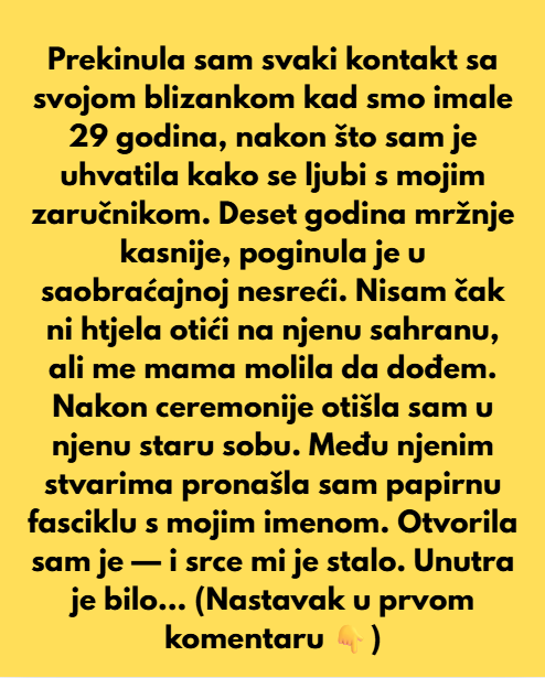 Ona je nedavno izgubila zivot u saobracajnoj nesreci. Nisam ni zelejla da idem na sahranu a naravno da je majka insistirala na tome. NAKON TOGA Otisla sam u njenu sobu. Dok sam gledala sve njene stvari nasla sam i fasciklu i tu je bilo moje ime.