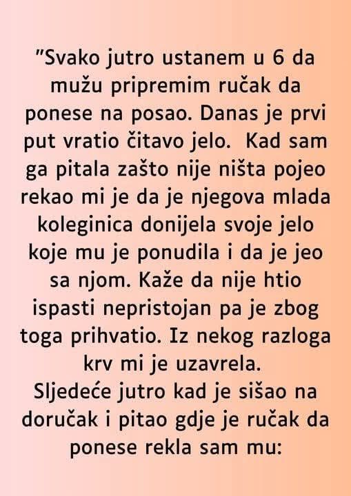 Sledece jutro kada je sisao na dorucak i pitao me gdje je rucak da ponese na posao rekla sam da nisam nista ni pravila jer koja je poenta da ja pravim i mucim se kada ce se to i onako baciti.