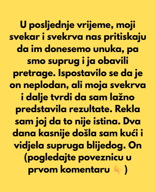 Dva dana poslije dosl sam kuci i vidjela sam supruga kako je blijed. Rekao je da je njegova majka pokusavala da ode u kliniku i predstavila se kao ja da bi dobila nalaze. Naraveno da joj nisu dali ali mozete mislite kakvo je to njeno razmisljanje i na sta je spremna-
