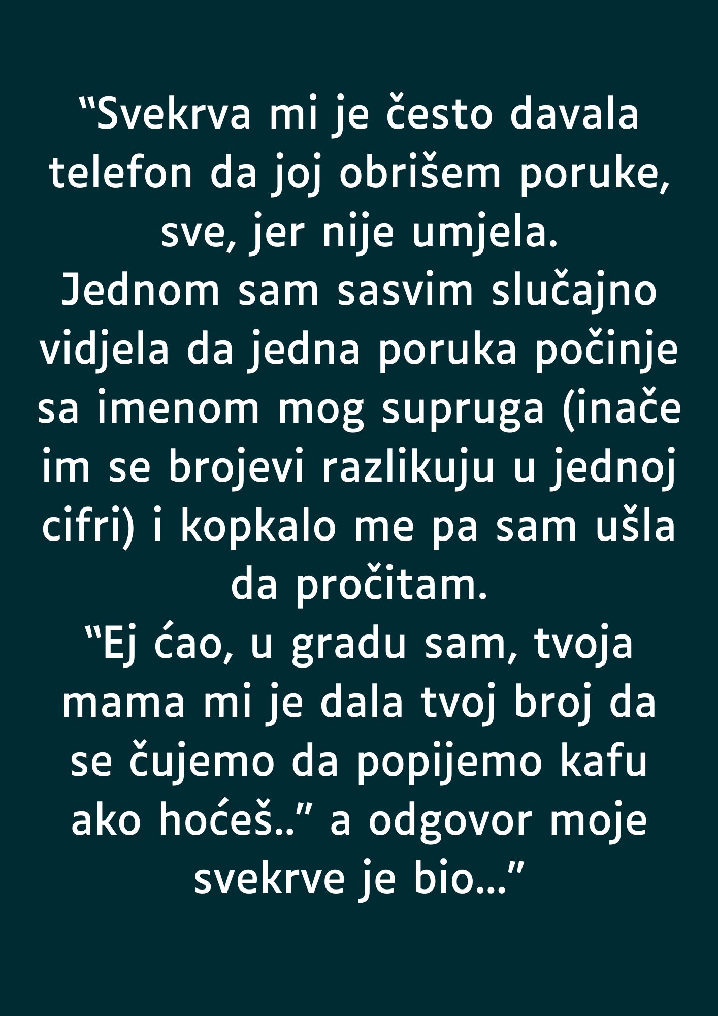 Moja svekrva je odgovorila na to : “Pogrijesila sam, dala sam ti svoj broj umjesto njegovog ali molim te suzdrzi se od spominjanja da sam ti ga dala da bi s njim razgovarao…”