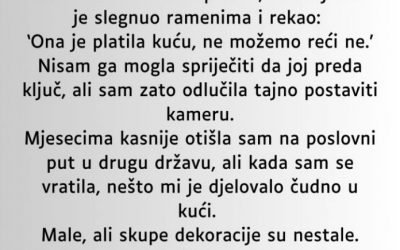 “Dobar dan, u gradu sam” Majka mi je dala tvoj broj pa ako zelis mozemo se naci na kafi i da popricamo…” Osjetila sam tada jako veliki hladan val koji je prosao kroz mene dok sam citala poruku to jeste odgovor od moje svekrve: “Oh napravila sam gresku dala sam ti svoj broj umjesto njegovog. Molim te nemoj mu reci da si dobila od mene ako slucajno uspijes da ga kontaktiras…”