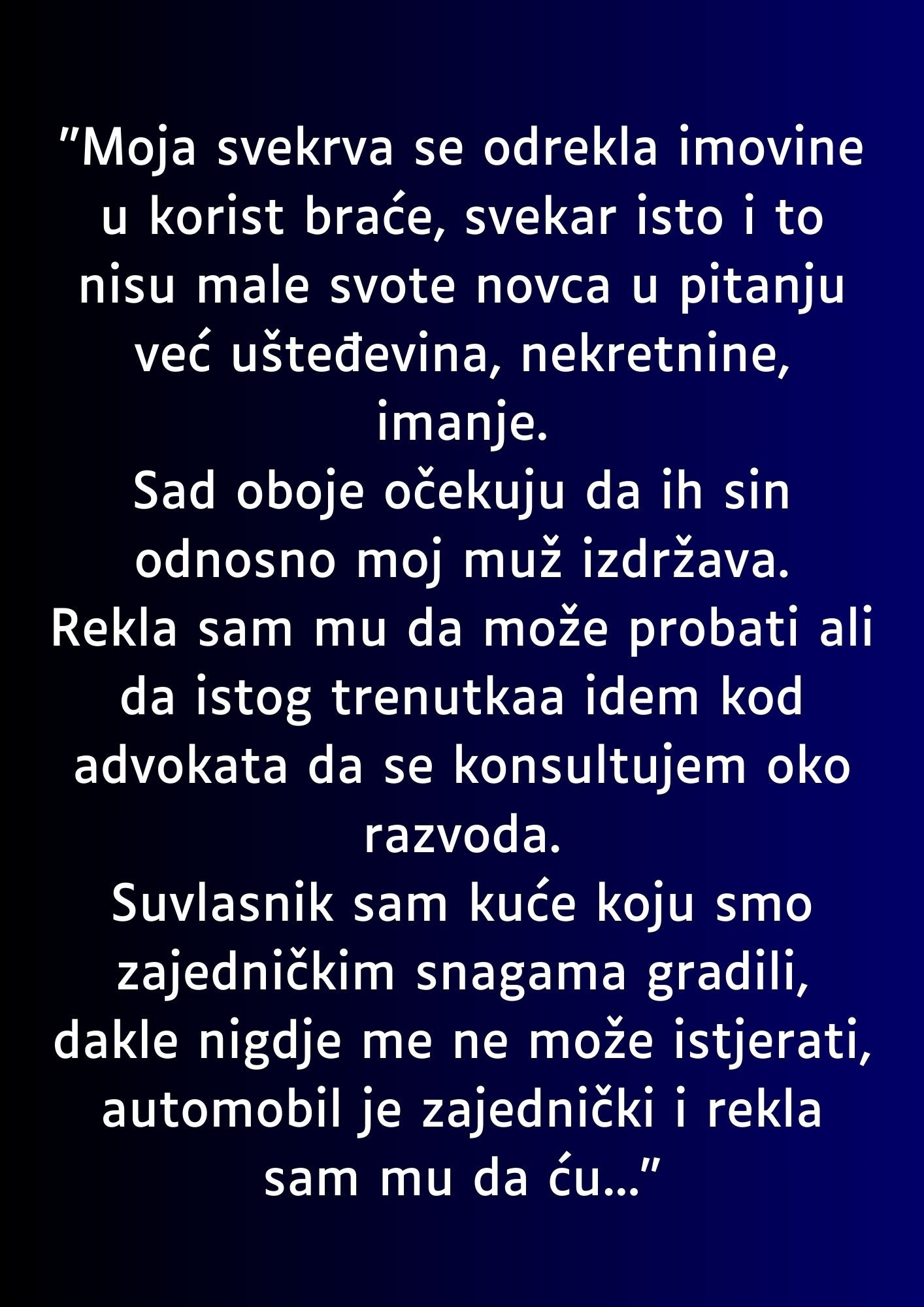 Moja svekrva je uradila jednu ludu stvar tako barem za nas. Ona se odrekla imovine i to u koristi brace a svekar isto i to nisu neke malene svote novca nego su to ustedjevine, nekretnine, mnogo imanja.
