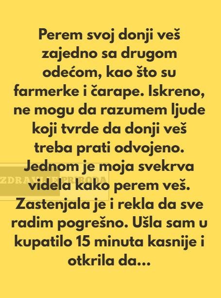 Jednom se desila takva situacija da je moja svekrva bial kod mene. Ona je tada vidjela kako ja perem svoj ves. Ona je tako se zacudila, zagalamila i rekla mi je da sve radim pogresno. Ja sam usla 15 minuta poslije toga u kupatilo i vidjela sam da je ona zaustavljala moju masinu, da je sve gace od mog supruga izvadila i moje vratila unutra i to ukljucila!