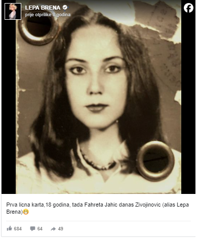 Na fotografiji iz perioda kada je Brena imala tek 18 godina, vidi se mlada djevojka tamne kose, prirodne ljepote i izražajnih crta lica. Slika je bila iz njenog prvog ličnog dokumenta, a podijelila ju je iz nostalgije prema mladim danima.