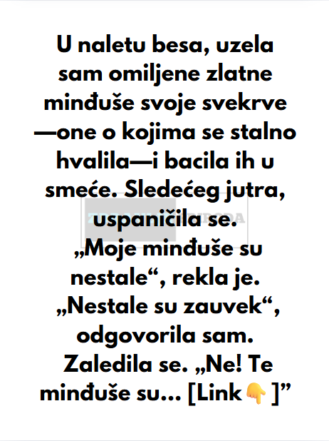 Tada sam tako tiho otisla u njenu sobu, otvorila ladicu i uzela njene omiljene zlatne mindjuse, one sa kojim se ona stalno hvalila. Toliko sam bijesna bila da sam ih bacila u kantu za smece i nije me bilo briga za to.