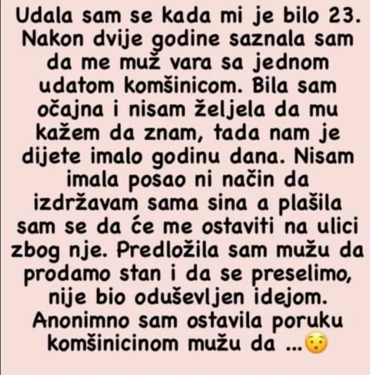 Ali onda sam odlucila da stvari uzmem u svoje ruke pa sam pstavila poruku muzu od komsinice da g aona vara a ona se tolikko preplasila i raskinula je preljubu. Muz je odjednom rekao da bi bila najbolja ideja da se preselimo pa smo to odlucili i da uradimo.