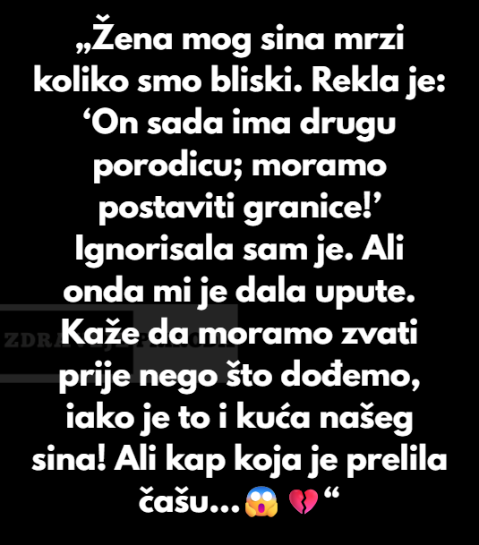 Supruga od mog sina mrzi sto smo mi jako bliski. Nas odnos je od samog pocetka tako. Ona je bila sretna kada smo mi platili svadbu pa i kucu ali sada u zadnje vrijeme kada god bi se vidjeli ona govori: On sada ima drugu porodicu, moraju se postaviti jasna pravila i granice i to vi morate da znate…”
